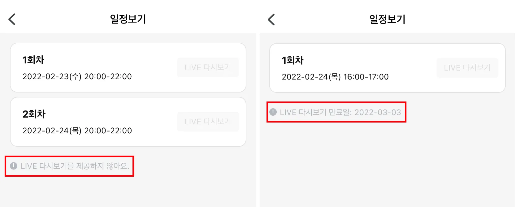 다시보기를 제공하는 경우 제공하지 않음으로 표시되며, 제공하는 경우 만료일자가 표시됩니다.